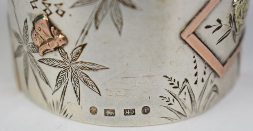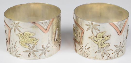 Cased pair of Elkington Victorian hallmarked silver aesthetic style hallmarked silver and rose gold napkin rings, London 1863/4, weight 56g
