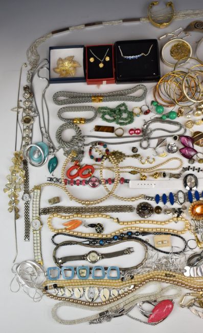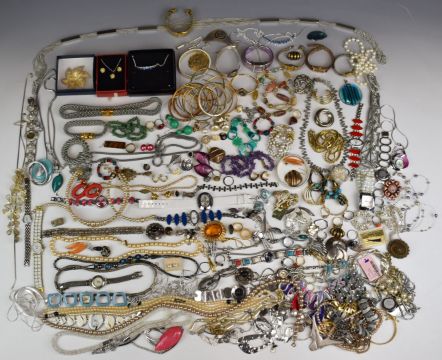 A collection of costume jewellery including silver filigree brooches, silver brooch, JewelCraft brooch, amethyst necklace, agate necklace, two pairs of silver earrings, Victorian brooch, etc