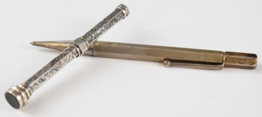 Eight hallmarked and other silver pens and pencils including fountain pen with 14ct gold nib, similar pen with De La Rue Onoto 14ct gold nib, Yard-o-Led and Life Long pencils,