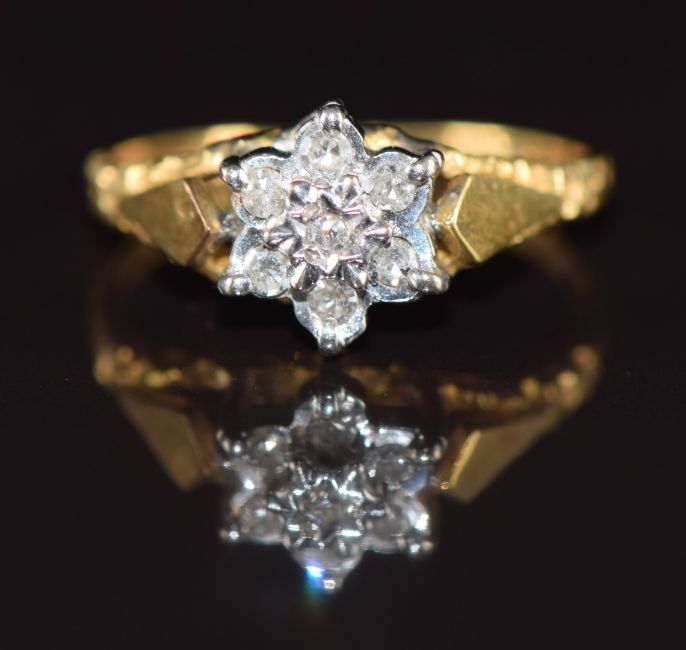 An 18ct gold ring set with diamonds in a cluster, 2.5g, size J