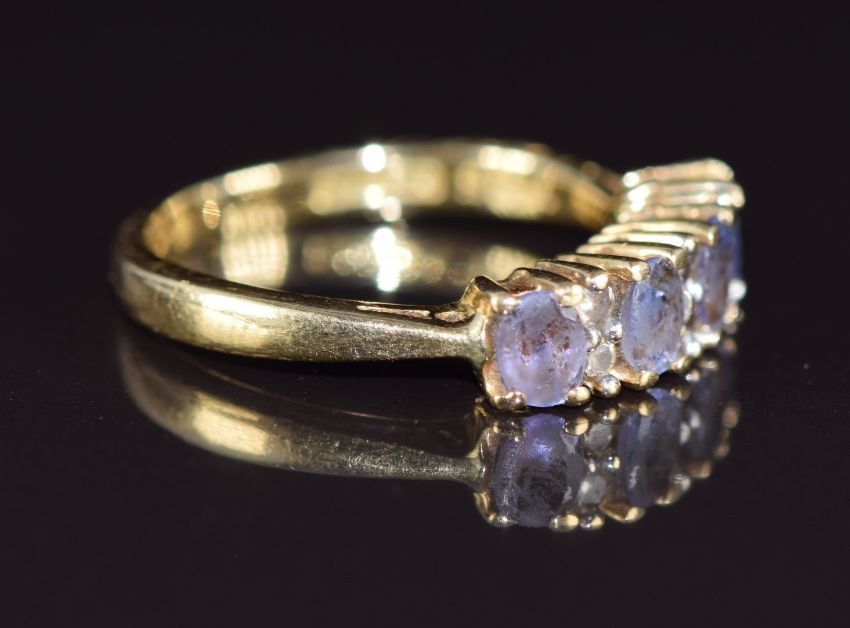 An 18ct gold ring set with oval cut tanzanites and diamonds, 2.7g, size I