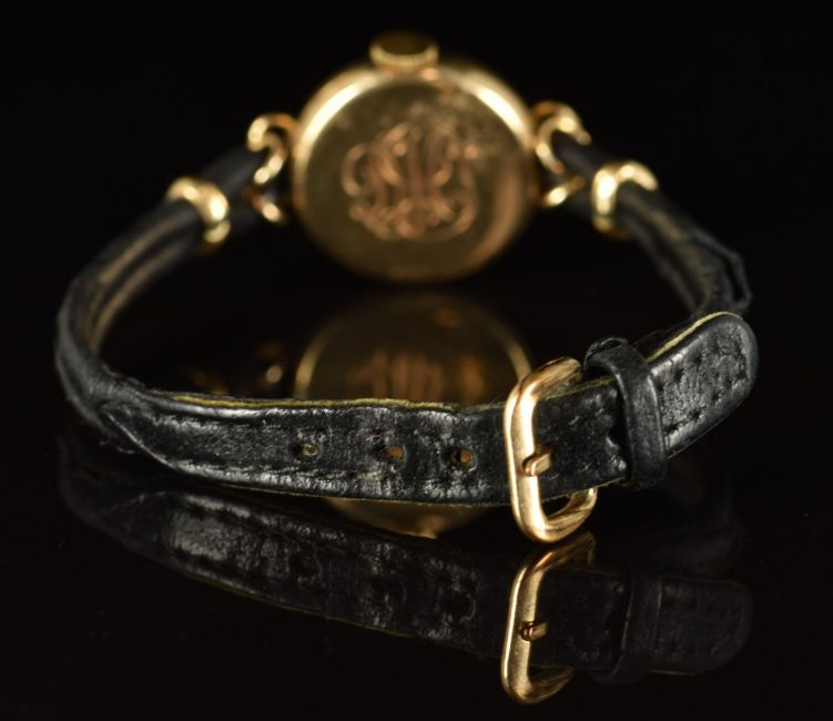 Tudor 9ct gold ladies wristwatch with subsidiary seconds dial, gold hands and Arabic numerals, white dial and signed movement, on black leather strap, case diameter 22mm, in original 'Tudor by Rolex Geneva' box.