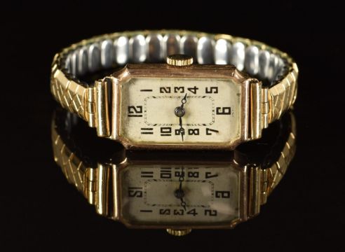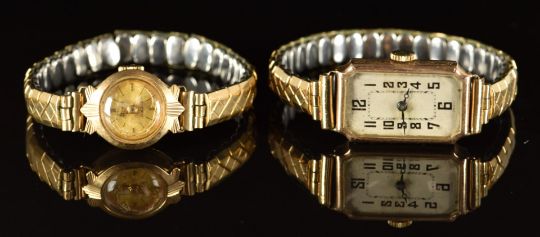 Two 9ct gold ladies wristwatches Accurist with gold hands and dial and an Art Deco example with blued Breguet hands, Arabic numerals and silver dial, both on expanding metal bracelets.