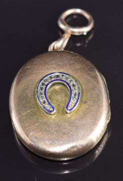 Victorian / Edwardian 9ct rose gold locket set with rose cut diamonds and blue enamel in a horseshoe design, 19g, 3.5 x 3cm