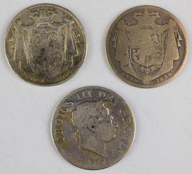 William IV half crowns 1834, F and 1835, F+-VF, with an 1817 George III, F