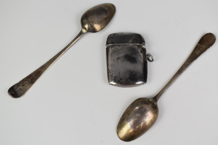 Two Georgian hallmarked silver bright cut teaspoons, together with a George V hallmarked silver vesta case with gilt interior, Birmingham 1920, maker John Thompson & Sons, weight of all three items 48g