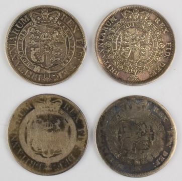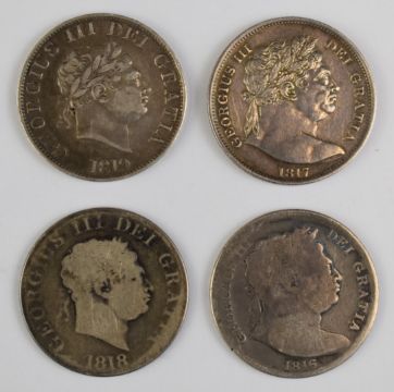 Four George III half crowns comprising bull heads for 1816, F and 1817, VF, with an 1818, F and an 1819 NVF example