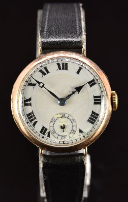 Rolex 9ct gold gentleman's wristwatch with subsidiary seconds dial, blued hands, black Roman numerals, white enamel dial and Ingersoll Elite 15 jewel movement, on black leather strap, case diameter 32mm, serial number 75129.