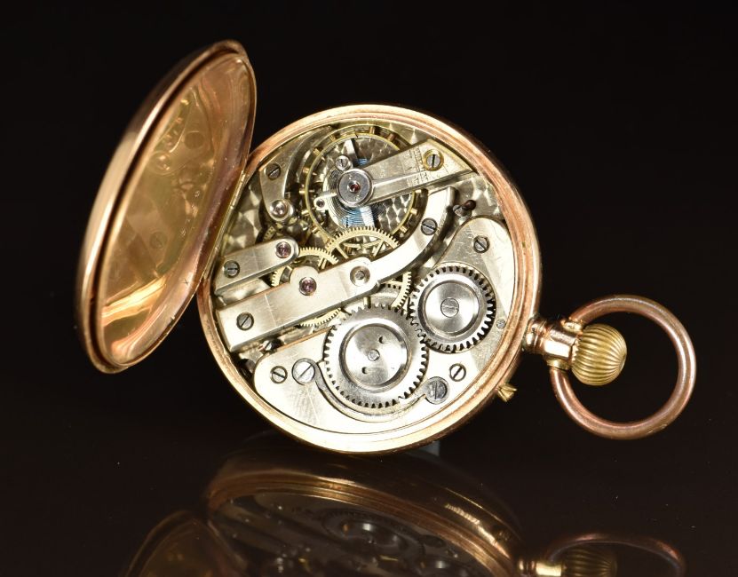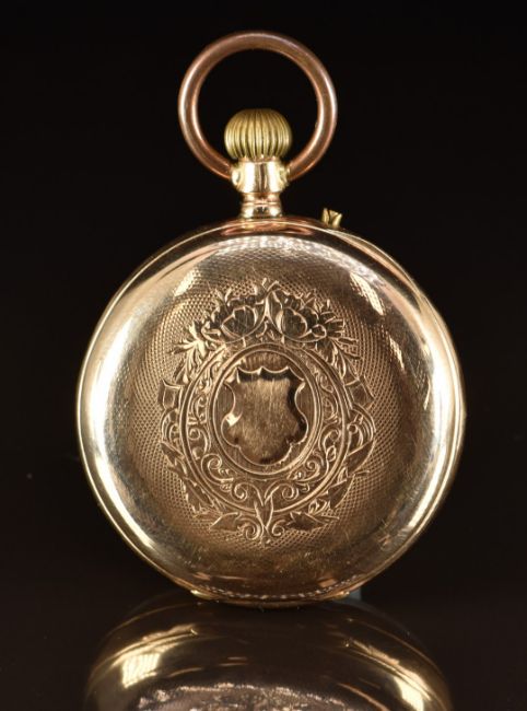 Unnamed 14ct gold keyless winding open faced pocket watch with inset subsidiary seconds dial, blued hands, black Roman numerals, white dial and unsigned movement, case diameter 47mm, serial number 3758, 75.6g.
