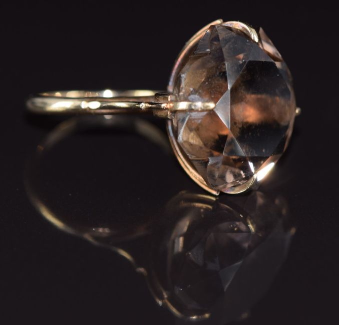 A 9ct gold ring set with a star cut smoky quartz, 7.8g, size L