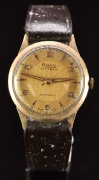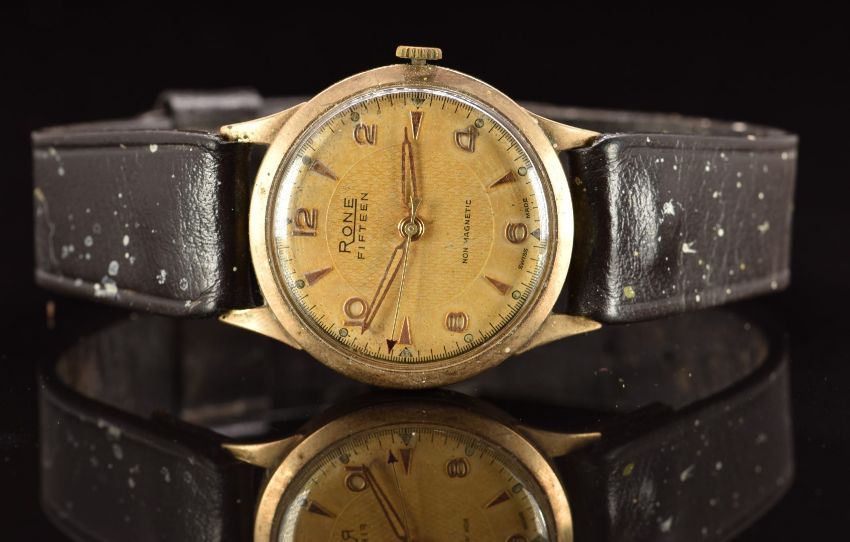 Rone Fifteen 9ct gold gentleman's wristwatch with skeleton hands, gold hour markers and Arabic numerals, champagne dial and unsigned 15 jewel calibre 1058 movement, case diameter 30mm, serial number 61302.