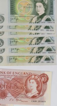 A collection of UK £1 notes to include J B Page, includes some uncirculated, a consecutive run of five and a few 10 shilling, J S Fforde examples