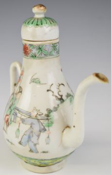 19thC Chinese covered wine pourer with figural decoration, height 16cm