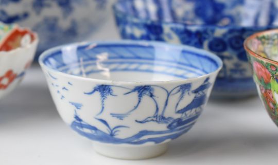 Five 19thC and later Chinese and Japanese bowls and a hallmarked silver Asprey lid, diameter 23cm