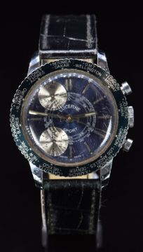 Lucerne Sport gentleman's world time chronograph wristwatch with blue dial and bezel, silver sub dials, luminous hands, silver baton hour markers, stainless steel case and mechanical movement, on black leather strap, case diameter 36mm.