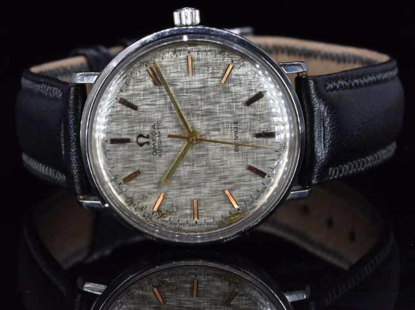 Omega De Ville gentleman's automatic wristwatch ref. 165.033 with two tone gold and black hands and baton hour markers, textured silver dial, stainless steel case and hand winding movement, on black leather strap, case diameter 34mm, serial number 27119000, with International Guarantee, related paperwork and wallet.
