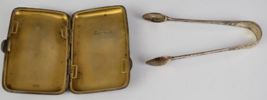 George V hallmarked silver cigarette case and a pair of silver Victorian sugar tongs, cigarette case Chester 1920, maker J & R Griffin, length 8cm, weight of both items 69g