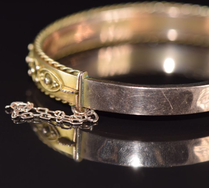 A 9ct gold bangle with applied decoration and rope twist border, 9.2g, 5.4 x 4.5cm