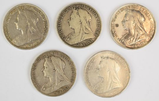Five Queen Victoria veiled head crowns 1895, 1896, 1897, 1899 and 1900, VF