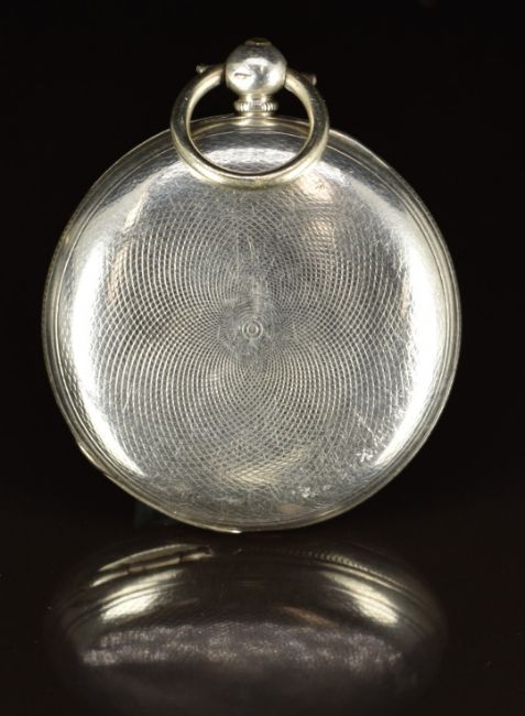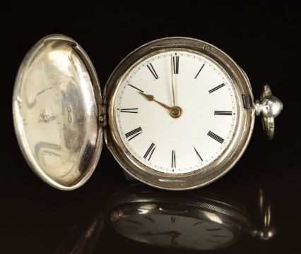 H Molyneux of London hallmarked silver full hunter pocket watch with gold hands, black Roman numerals, white dial and signed fusee movement, case diameter 44mm, serial number 15089.
