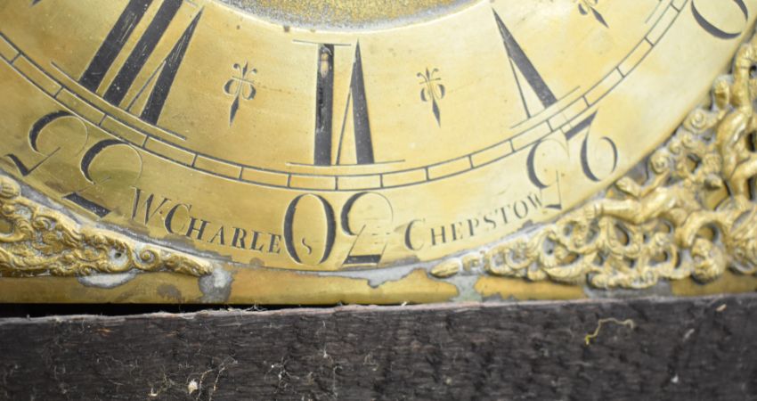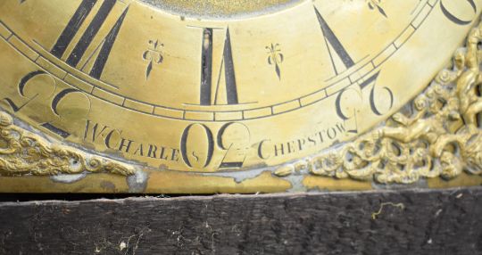 W Charles, Chepstow, Wales, 30 hour longcase clock with brass dial and carved oak case, width of dial 28cm, height 200cm