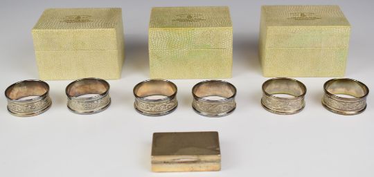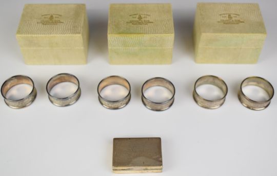 Set of six hallmarked silver napkin rings, Birmingham 1972, maker Henry Griffith & Sons Ltd, in Grant & Son North Shields boxes, together with an Edward VII hallmarked silver vesta case, Chester 1908, maker Colen Hewer Cheshire, weight of all items 123g