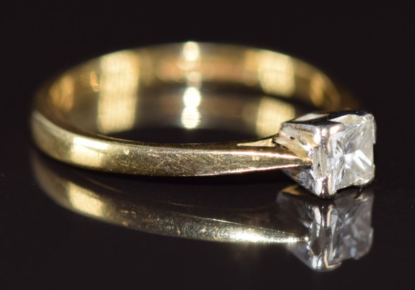 An 18ct gold ring set with a princess cut diamond of approximately 0.3ct, 2.6g, size M