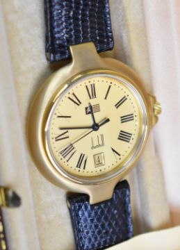Dunhill watch, Dunhill stud, Dunhill cufflinks and pen together with two silver pots, all cased