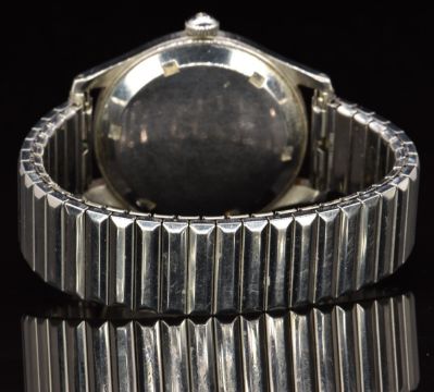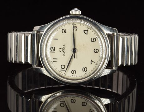 Omega military style gentleman's wristwatch ref. 2384 with steel hour and minutes hands, black centre seconds hand and Arabic numerals, white dial, stainless steel case and signed 17 jewel movement, case diameter 35mm, serial number 11055302.