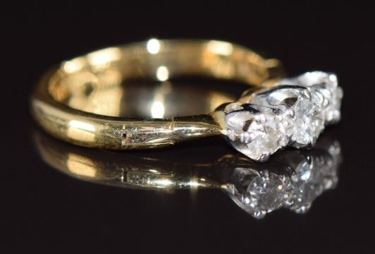 An 18ct gold ring set with three diamonds, the largest diamond approximately 0.16ct, with expandable band, 2.4g, size G