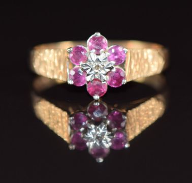 A 9ct gold ring set with a diamond surrounded by rubies, 1.8g, size M