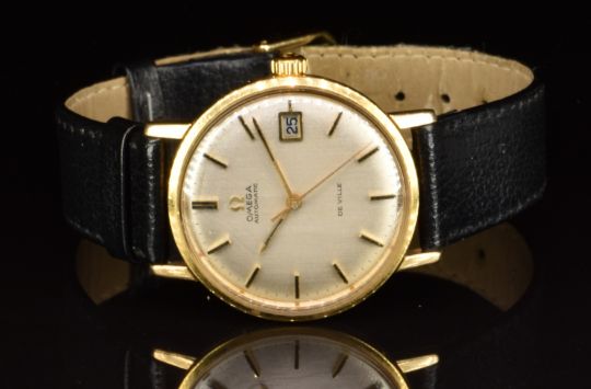 Omega DeVille gold gentleman's automatic wristwatch with date aperture, two-tone hands and baton markers, silver dial and signed movement, on black leather strap, case diameter 34mm, in original box with International Guarantee.