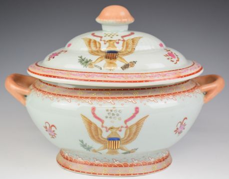 Chinese twin handled covered armorial tureen and matching meat dish, height 28cm