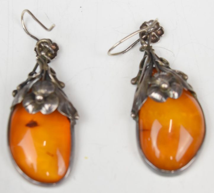 Eight pieces of silver jewellery set with pressed amber including two bracelets, three pairs of earrings, two rings and a large pendant