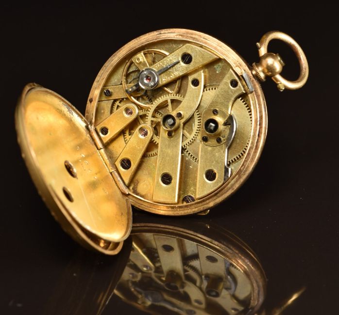 Unnamed 18ct gold open faced pocket watch with blued hands, black Roman numerals, engraved gold dial, engraved case and unsigned movement, case diameter 34mm, 28g.