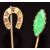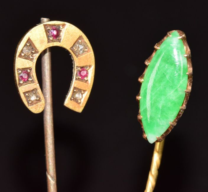 Edwardian 15ct gold stick pin in the form of a horseshoe set with diamonds and rubies (1.1) and a yellow metal stick pin set with a marquise cut jadeite cabochon (1.4g)