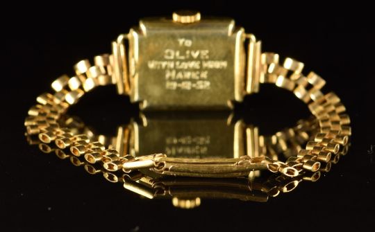 Omega ladies wristwatch with gold hands and Arabic numerals, silver dial and signed 15 jewel movement, on 9ct gold bracelet, case diameter 17mm, serial number 9852668, 13g.