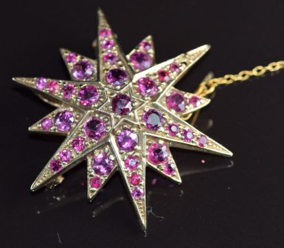 A 9ct gold pendant / brooch in the form of a star set with rubies, 8.4g, 3.5cm (one ruby missing)
