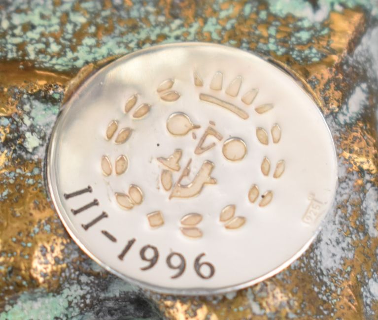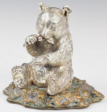 White metal figure of a panda eating bamboo, on raised bronze base, with plaque to base marked 925 and dated III-1996, height 14cm