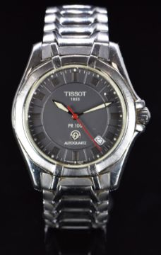 Tissot Autoquartz gentleman's kinetic wristwatch ref. P680/ 780 with date aperture, luminous hands, silver hour markers, grey dial, stainless steel case, clear exhibition case back and signed 17 jewel automatic Autoquartz movement, on stainless steel bracelet, case diameter 38mm.