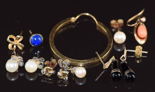 A pair of 14k white gold earrings each set with a pearl and diamond (1.6g), a pair of 9ct gold earrings set with onyx, a pair of 9ct gold earrings set with a diamond, 9ct gold single earrings, 15ct gold single earring set with coral and a seed pearl (0.8g), 18ct gold single earring (1.7g) and a 9ct gold charm set with a pearl and diamonds