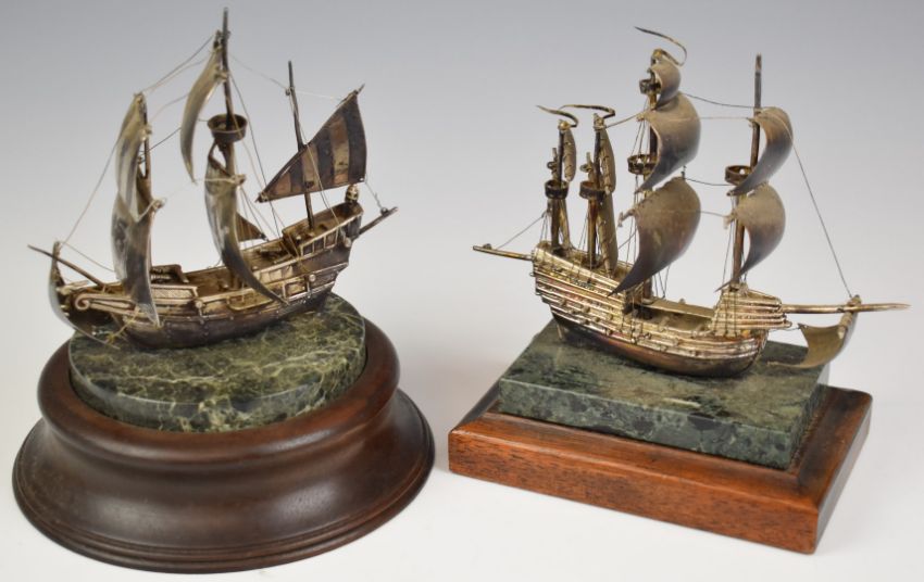 Two hallmarked silver models of sailing ships, one limited edition (220/500) of the Mary Rose, overall height of taller 15.5cm