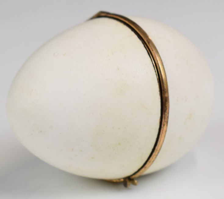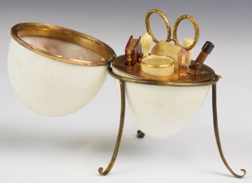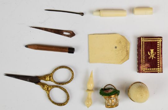 A 19thC etui case, the egg shell case opening to reveal a fitted gilt interior set with ivory thimble and accessories including 1818 book of the year, height 9.5cm, with ivory licence
