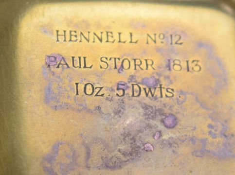 Four Hennell copper and brass example silversmithing pieces, each engraved with the original maker of the style and also its weight, comprising David Willaume, Henry Chawner, John Emes and Paul Storr, diameter of largest 12.5cm