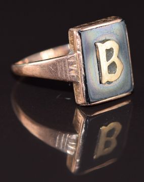 A 9ct rose gold ring set with onyx with a gold letter B, 2.1g, size L
