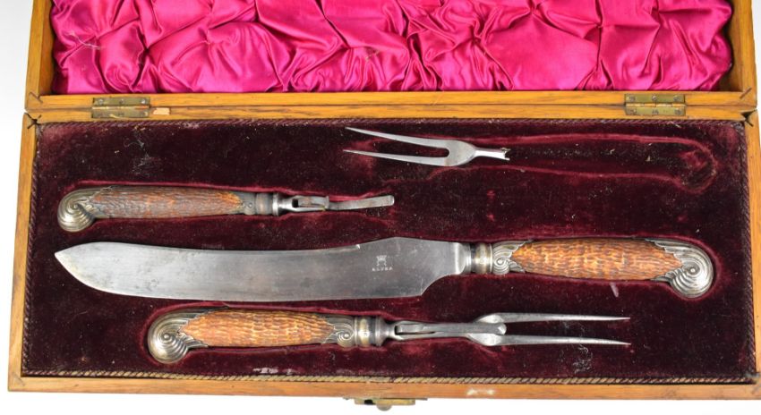 Cased hallmarked silver mounted horn handled carving set, Sheffield 1906, maker's mark HH, in oak inlaid case, length 48cm