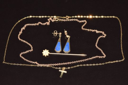 A 9ct rose gold chain, 9ct gold cross and chain, 9ct gold stick pin set with a seed pearl and 9ct gold earrings set with lapis lazuli, 6.4g