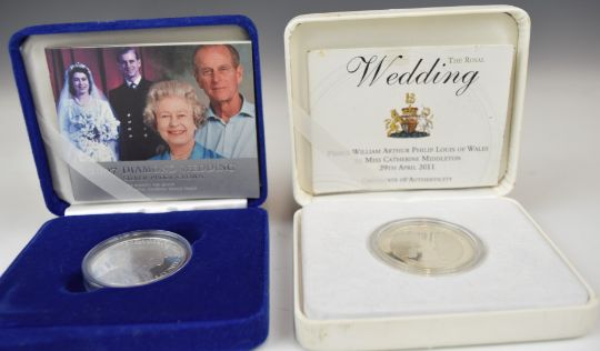 Two Royal Mint silver crowns, comprising proof 2007 Diamond Wedding and 2011 Royal Wedding, both with certificates in original cases