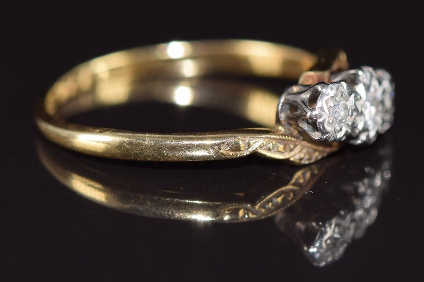An 18ct gold ring set with three diamonds in a platinum setting, 2.3g, size M