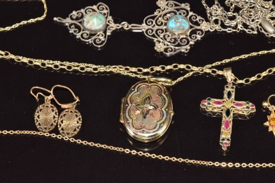 A 9ct gold tri-coloured locket, 9ct gold cross pendant set with rubies, sapphires and peridot, two pairs of 9ct gold earrings, a 9ct gold chain (15.5g) and a silver necklace set with turquoise